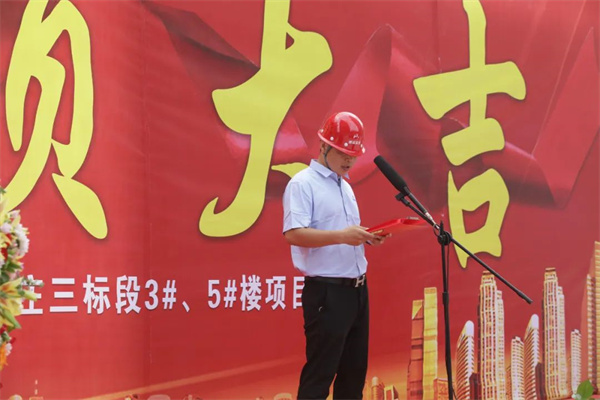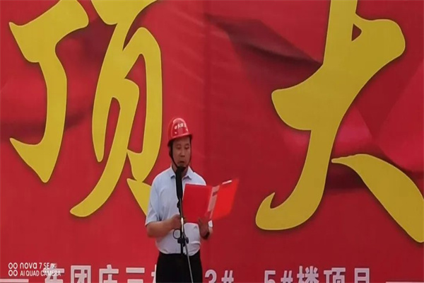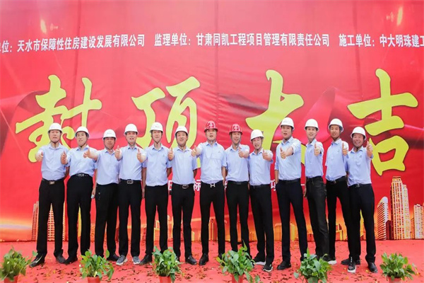 上午9时58分,封顶仪式隆重举行,项目建设单位天水市保障性住房建设发展有限公司、施工单位中大明珠建工有限公司、监理单位甘肃同凯工程项目管理有限责任公司等参建单位领导,陕西日升建筑劳务有限责任公司东团庄项目项目经理徐德峰、项目部管理人员共同参加封顶仪式,见证这一激动人心的时刻。