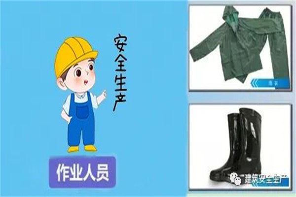 (1)雨天施工前,项目部应提前做好防汛准备,备足防汛应急物资和器材,作业人员应配备雨衣、雨鞋等防护用品。